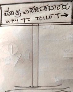 ಅಲ್ಲೊಂದು ದ್ವಿಭಾಷಾ ತುಕ್ಕು ಹಿಡಿದ ಬೋರ್ಡು ಎದುರಾಯ್ತು “ಮೂತ್ರ ವಿಸರ್ಜಿಸಬಾರದು. Way to toilet”! ನಾವು ಮನೋಭಿತ್ತಿಯಲ್ಲಿ ಅದಕ್ಕೆ “ಇಲ್ಲಿ…” ಸೇರಿಸಿದ್ದಲ್ಲದೆ, ನಮಗೆ ಇಂಗ್ಲಿಷೂ ತಿಳಿದ ಕಾರಣದಿಂದ, ಜಲಗಂಡದಿಂದ ಬಚಾವಾದೆವು. ಮತ್ತೆ ಚಾ ಏರಿಸಿ ಹೊರಡುವಾಗ, ಹೊಟೆಲ್ ಯಜಮಾನರಿಗೆ ಬೋರ್ಡ್ ತಿದ್ದಲು ಸೂಚಿಸಿಯೇ ಬಂದೆವು. ಆದರೂ ನನ್ನ ತಲೆಯೊಳಗೆ ನಗೆ ಚಕ್ರ ತಿರುಗುತ್ತಲೇ ಇತ್ತು. ಯಜಮಾನರೇನೋ ‘ಇಲ್ಲಿ’ ಸೇರಿಸಿಯಾರು. ಆದರೆ ಸ್ಥಳೀಯ ಪೋಕರಿ, ‘ಲ’ ಒತ್ತು ಕೆರೆಸಿ ತೆಗೆದರೇ?! ವಿದ್ಯಾಗಣಪನ ವಾಹನಕ್ಕೆ (ಸಾಕ್ಷರ ಇಲಿಗೆ) ಅವಮಾನವಾಗದೇ? ಅದರ ಮೇಲೆ, ಶನಿ ವಾಹನ – (ಬೀದಿ) ನಾಯಿ, ನಿರಕ್ಷರಕುಕ್ಷಿ, ಎಂದಿನಂತೆ ಕಂಬಕ್ಕೆ ಕಾಲೆತ್ತದಿದ್ದೀತೇ?